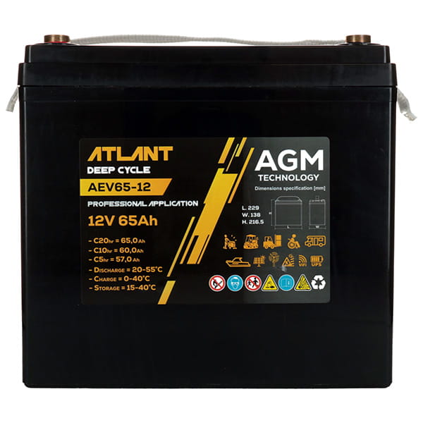 Specyfikacje dla Akumulator ATLANT Deep Cycle 12V 65Ah AEV65-12 230*138*210 L Atlant AEV65-12