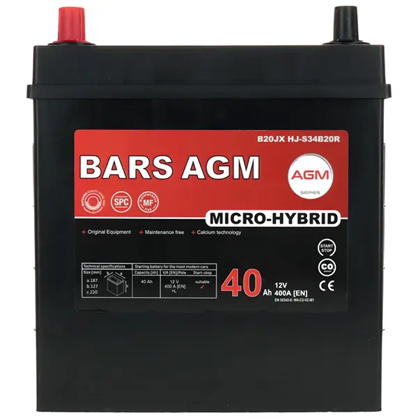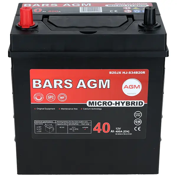 Specyfikacje dla Akumulator Bars HYBRID AGM LINE 40Ah+L 400A B20JX HJ-S34B20R Start-Stop L Bars BM40L