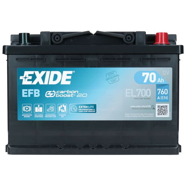 Akumulator EFB (Enhanced Floaded Battery) marki Exide jest uznawany za najbardziej zaawansowany w przemyśle motoryzacyjnym. Powstał dzięki inwestycji firmy w prace badawczo-rozwojowe i doświadczeniu zdobytemu we współpracy z wiodącymi producentami samochodów. Akumulator EFB najnowszej generacji oferuje znacznie lepszą zdolność przyjmowania ładunku i dłuższą żywotność w pracy cyklicznej, co jest wynikiem przełomu w pracach badawczo-rozwojowych w zakresie stopów ołowiowych i wyjątkowych dodatków węglowych. Akumulatory Exide EFB doskonale współpracują z systemami Start-Stop, hamowania regeneracyjnego i innymi funkcjami oszczędzania paliwa.