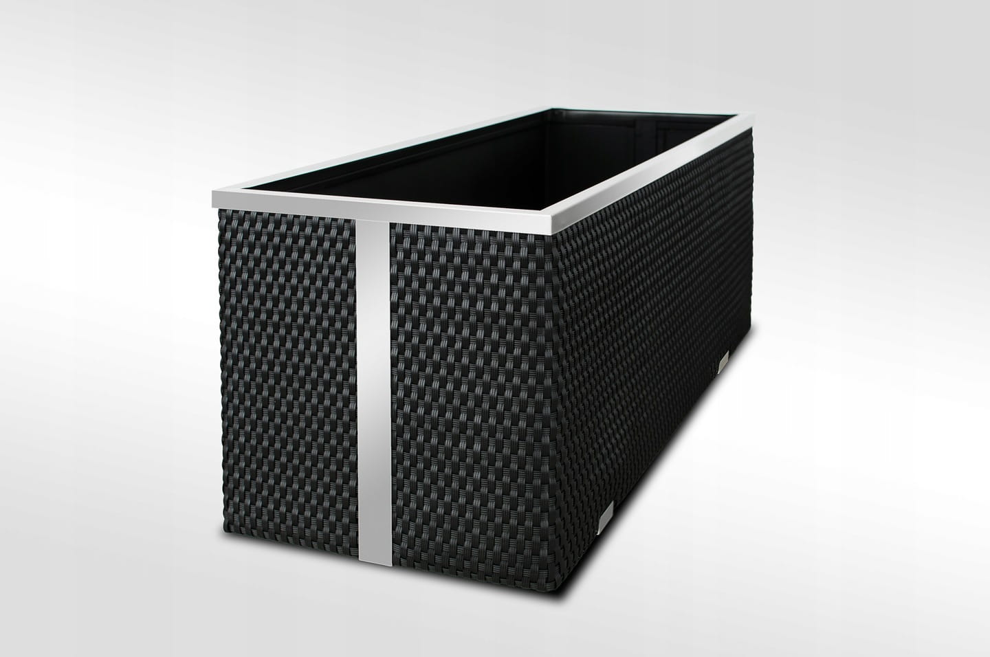Donica wykonana z wyplatanego technorattanu. Wnętrze wykonane z blachy ocynkowanej. Listwy ozdobne wykonane z polerowanego aluminium.